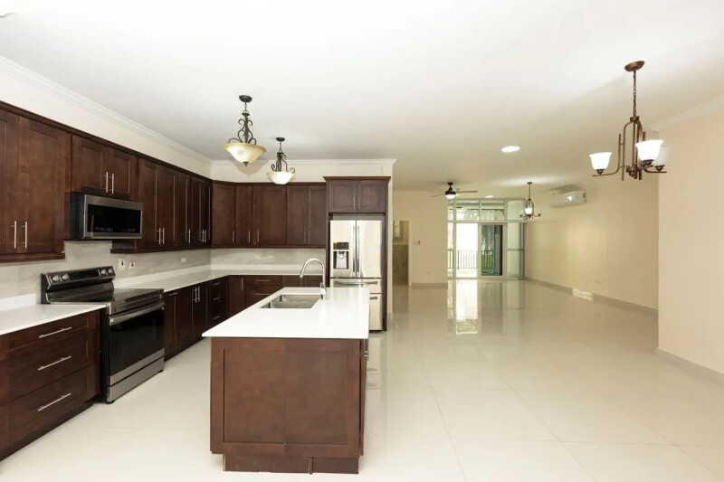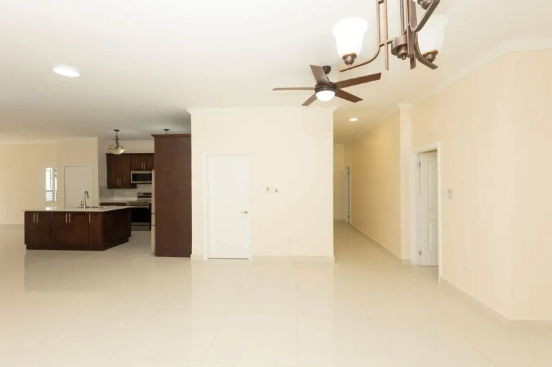 Brand New! Russell Heights, Kingston 8: Here's a sunny, spacious and luxurious modern apartment that is located on the ground floor. This move-in ready condo features 10'-0' ceiling heights with 3 bedrooms, 3 bathrooms, a powder room, a full-size laundry and a private outdoor patio. The patio serves the master suite and the living area. All bedrooms feature an en-suite, walk-in closets and share a wrap-around veranda. The exterior windows/doors are already wired for security and motion detection. Air-conditioning units, ceiling fans and decorative light fixtures are installed throughout; as well as major kitchen appliances, washer/dryer and an instant water heater. There are two (2) covered parking spaces. Community amenities are generous: 24 hr. guard, guest parking, pool and clubhouse, back-up water and generator. Then there is location, location, location. You just won't beat this central location!